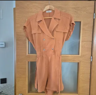 Mono corto de Pull&Bear, talla M, en color naranja teja. Diseño tipo safari muy estiloso, con doble botonadura frontal, bolsillos en el pecho y cinturón del mismo tejido para ajustar la cintura y marcar la silueta. Mangas sin hombro caído, corte cómodo y tejido ligero, ideal para verano y entretiempo. Queda muy favorecedor y es perfecto tanto con zapatillas como con sandalias o botines.