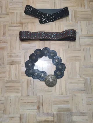 Conjunto de 3 cinturones para mujer con diseños variados. - Cinturón negro con tachuelas plateadas. - Cinturón marrón con detalles en color turquesa. - Cinturón con medallones metálicos y hebilla ornamental.,este último lo regalo porque tiene un fallo .El precio es de los 2 juntos.