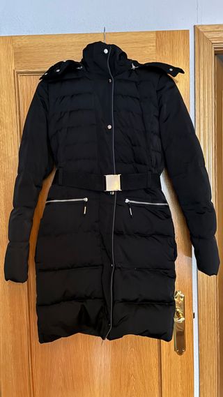 Abrigo largo de Mango con cinturón y capucha. - Diseño acolchado. - Capucha con pelo. - Cinturón ajustable con hebillas. - Cremallera frontal. - Bolsillos con cremallera.