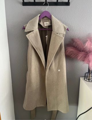 Chaleco largo de paño con cinturón. - Diseño sin mangas. - Cuello solapa. - Cierre cruzado con botón. NUEVO CON ETIQUETA ORIGINA 40€