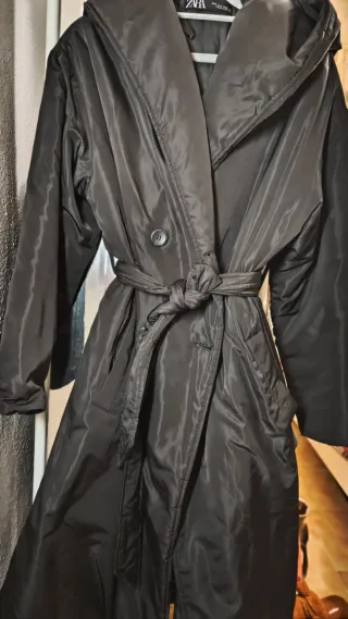 Abrigo largo estilo gabardina de Zara. Es calentito y repele el agua. - Diseño largo. - Cierre de doble botonadura y cinturón - Con relleno - Bolsillos laterales. - Con capucha Colección 2024 Largo 105cm Ancho sisa a sisa 60cm