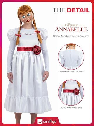 Smiffys Disfraz de Annabelle para adultos, vestido blanco inquietante con cinturón de flores, disfraz de muñeca Annabelle con licencia oficial, espalda con cremallera, perfecto para Halloween, fiestas K2
