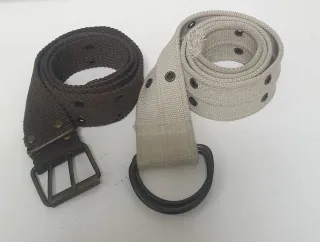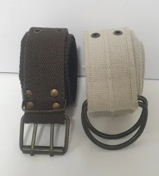 Conjunto de dos cinturones de tela, uno en color marrón y otro en beige. - Cinturón marrón con hebilla metálica de tres pasadores. - Cinturón beige con doble anilla metálica.