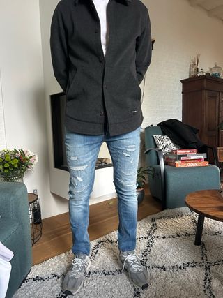 Pantalones vaqueros Dehman en tono azul con un diseño moderno y desgastado. - Corte ajustado. - Detalle de rotos y desgastes. - Cintura con trabillas para cinturón.