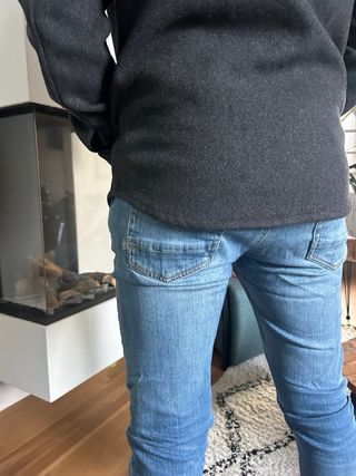 Pantalón vaquero con un diseño moderno y detalles únicos. - Cintura con trabillas para cinturón. - Cierre de botón y cremallera. - Bolsillos delanteros y traseros. - Puños elásticos con fruncido en los tobillos. - Pequeños bordados decorativos en la zona de la cintura.