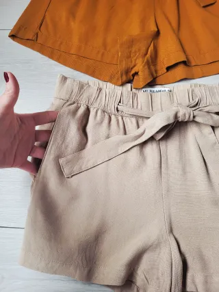 Conjunto de dos pantalones cortos de mujer. - Unos de color beige con cinturón anudado. - Otros de color teja con bolsillos.