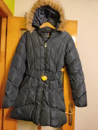 Chaqueta de invierno para mujer, con un diseño acolchado y cinturón. Lo compré en El Corte Inglés por 70 euros. Solo lo uso 4 veces - Capucha desmontable con pelo. - Cinturón con hebilla dorada. - Cremalleras decorativas en los bolsillos.