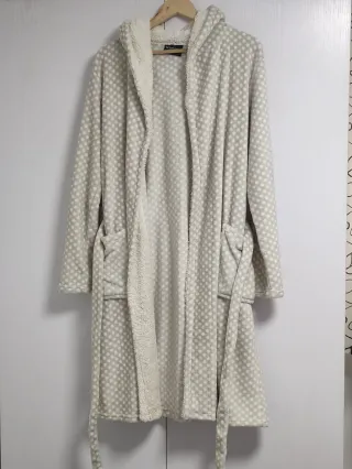 Bata de estar por casa con un suave estampado de topos. Talla L pero da para una XL perfectamente. - Diseño con capucha. - Cinturón para ajustar. - Bolsillos laterales.