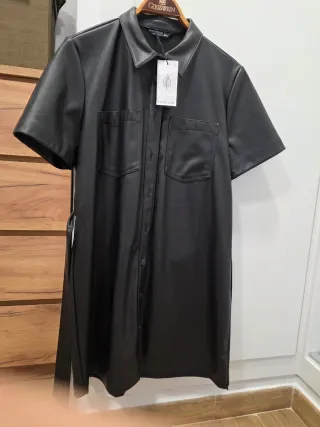 Vestido de Stradivarius con acabado polipiel. - Diseño camisero. - Manga corta. - Dos bolsillos en la parte delantera. - Cinturón a juego.