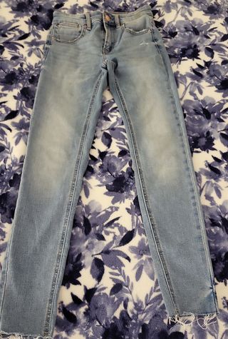 Pantalón vaquero de corte moderno con un ligero efecto desgastado. Ideal para un estilo casual. - Cintura con trabillas para cinturón. - Cierre de cremallera y botón. - Bolsillos delanteros y traseros. - Bajo deshilachado. Cosas en mi perfil imteresantes12 LAS DOS PRENDAA