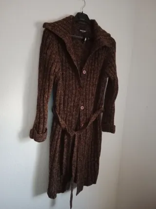 Abrigo de punto grueso en color marrón, con cinturón para ajustar. - Diseño de canalé. - Cuello amplio. - Cierre de botones.