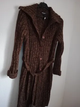 Marca talla XS pero se puede usar incluso como talla L, es un modelo ancho que se ajusta con el cinturón, se puede llevar también abierto. Tiene alguna pequeña bola que una vez puesto no se aprecia.