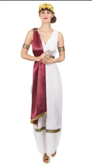 Este disfraz evoca la elegancia de la antigua Grecia. - Vestido largo blanco con detalles dorados. - Túnica drapeada en color burdeos. - Corona dorada. - Brazaletes y cinturón a juego.