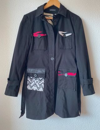Gabardina de la marca Paramita con un diseño único. - Color negro con detalles multicolor. - Bolsillos frontales con adornos. - Cinturón para ajustar. - Puños con trabillas.r