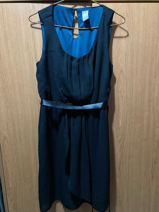 Elegante vestido negro sin mangas, ideal para eventos o para el día a día. Presenta un diseño con detalles plisados en el pecho y un cinturón a juego que realza la figura. - Escote redondo. - Cierre de lágrima en la espalda. - Forro interior azul.