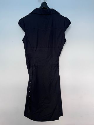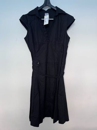 Vestido elegante de color negro, ideal para diversas ocasiones. - Diseño con cuello camisero. - Detalle de botones en la parte frontal. - Cinturón a juego para marcar la cintura. - Sin estrenar.