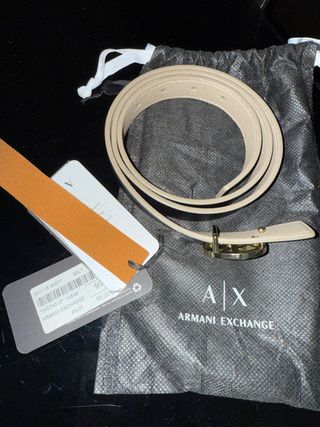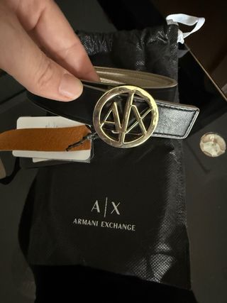 Elegante cinturón de Armani Exchange. - Diseño fino y sofisticado. - Hebilla dorada con logo. - Textura de piel granulada. - Reversible negro y beige