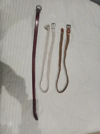 Conjunto de tres cinturones para mujer. - Un cinturón de cuero burdeos liso 90 cms. - Un cinturón tejido de color beige 110 cms - Un cinturón tejido de color marrón 110 cms