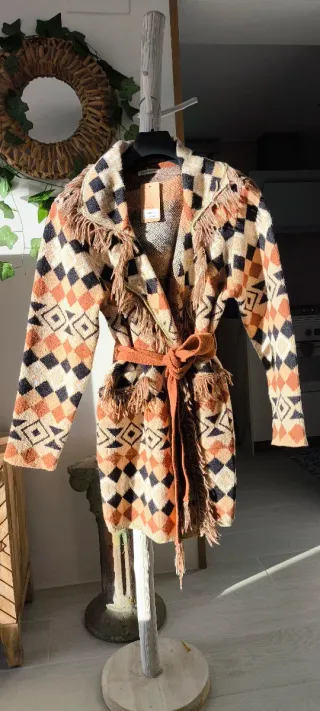 Chaqueta de lana de corte 3/4 con un diseño étnico y flecos. - Tejido suave y cálido. - Incluye cinturón a juego. - Estampado geométrico en tonos tierra.