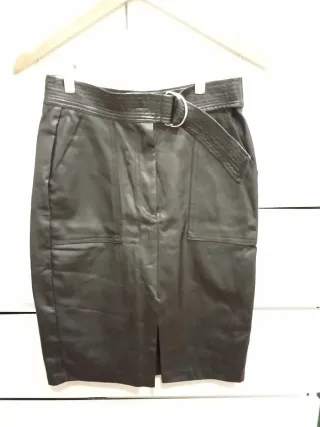Elegante falda de cuero sintético en color negro. Presenta un diseño moderno con detalles que la hacen única. - Cinturón incluido con hebilla metálica. - Bolsillos frontales. - Abertura en la parte delantera. - Costuras detalladas en la cintura. -NO HAGO ENVÍOS-