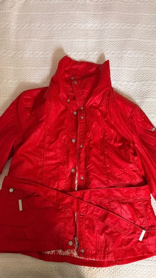 Chaqueta de mujer en color rojo intenso de la marca Historias de Mujer (Barcelona). Diseño elegante y femenino, con cinturón ajustable, cierre de cremallera y botones, y cuello alto. Estado muy bueno, sin roturas ni defectos importantes. Tejido ligero, ideal para entretiempo. Color vivo y actual, queda muy bien puesta.