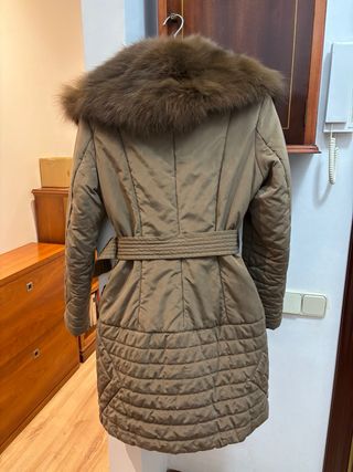 Chaqueta de plumón con capucha de pelo sintético. - Cierre de cremallera y botones a presión. - Cinturón ajustable con hebilla metálica. - Bolsillos frontales con cremallera y tirador. - Puños interiores de canalé.
