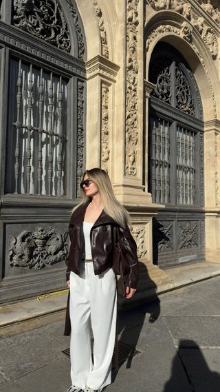 Conjunto de moda con chaqueta de cuero - Chaqueta de cuero estilo biker.