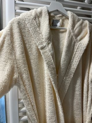 Albornoz suave y cómodo con capucha. - Material: Tejido agradable al tacto. - Diseño: Con cinturón para ajustar. - Bolsillos: Dos bolsillos frontales.