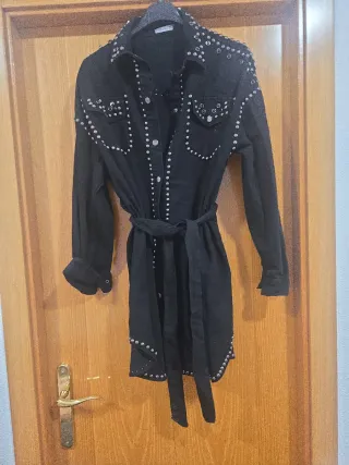 Vestido negro con un diseño llamativo y moderno. - Detalle de tachuelas plateadas. - Cinturón a juego para ajustar la cintura. - Cuello camisero y cierre de botones.