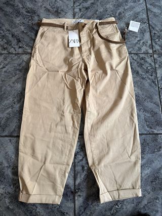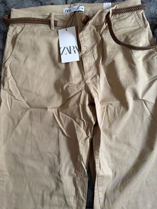 Pantalón estilo chino de la marca Zara. - Modelo de corte recto. - Cinturón trenzado incluido. - Dos bolsillos laterales. - Dobladillo en los bajos.