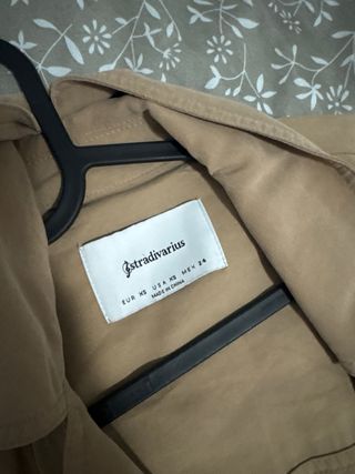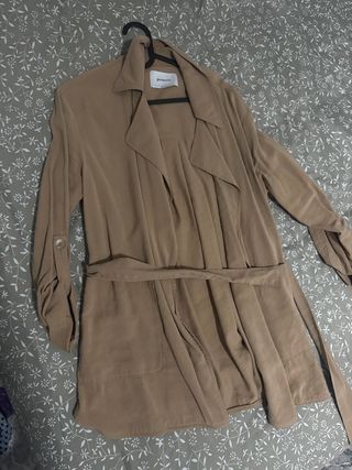 Elegante blazer de Stradivarius en color camel, perfecto para añadir un toque sofisticado a tu armario. - Diseño tipo gabardina con cinturón. - Mangas enrollables con botón. - Bolsillos frontales. Talla bastante amplia