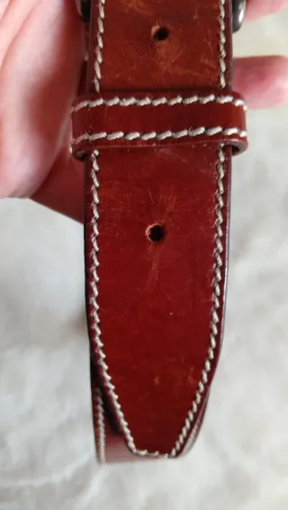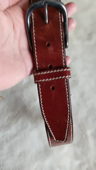 Elegante cinturón de piel de vacuno en un bonito tono marrón cobre. Un accesorio clásico y versátil. - Material: Piel de vacuno. - Acabado: Marrón cobre. - Costuras blancas decorativas. Talla pequeña 36/ 38 de pantalon Ancho 3'5