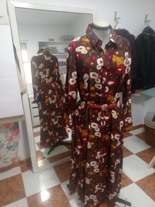 Vestido largo con estampado floral multicolor sobre fondo marrón. Presenta cuello camisero y cinturón a juego. - Manga larga. - Cierre de botones. - Cinturón trenzado con detalles.