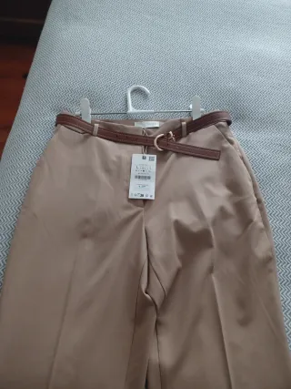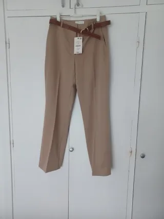 Dos Pantalónes de corte recto en color beige, y otro negro con un cinturón. - Cinturón con hebilla metálica dorada - Dos bolsillos laterales. Detrás no tiene bolsillos, pero si parece que son bolsillos. Talla L, está sin estrenar, el beige conserva todavía la etiqueta, el negro no, pero no se ha estrenado. Cada uno 16 €, los dos juntos 30 €