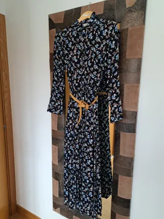 Vestido midi de Zara con cinturón. - Diseño con volantes en el escote. - Manga larga abullonada. - Cierre de botones en la parte delantera. - Cinturón negro a juego.