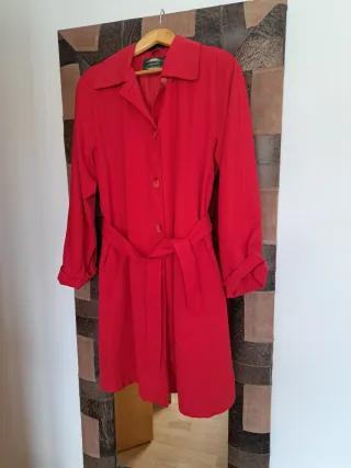 Gabardina elegante de color rojo, ideal para añadir un toque de estilo a cualquier atuendo. - Diseño clásico con cinturón. - Cuello solapa. - Cierre de botones.