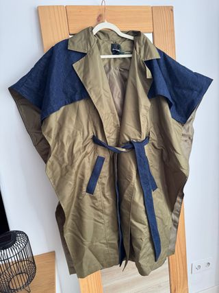 Gabardina Desigual de corte abierto, combinando tejido verde y detalles en tejano. - Diseño sin mangas. - Cinturón a juego. - Cuello solapa.