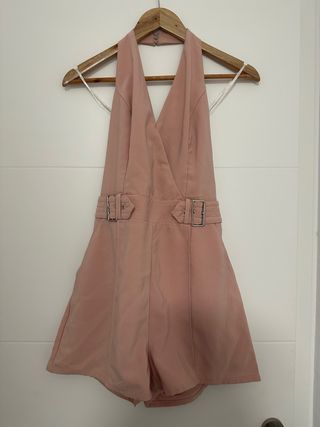 Mono corto de color rosa con un diseño elegante y moderno. - Dos bolsillos espaciosos. - Escote pronunciado en V. - Detalle de cinturón con hebillas. - Espalda abierta. - Corte tipo short. - Manchas pequeñas en el pecho y partde del bolsillo. - Usado Una sola Vez