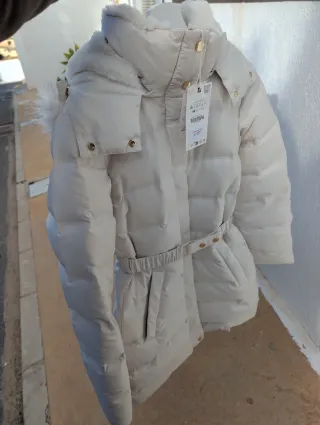 Abrigo mujer plumas plumífero de Zara, con etiqueta y sin usar. Es de la colección Invierno actual 2026. - Capucha con detalle de pelo. - Cinturón ajustable. - Cierre de botones dorados. - Color blanco roto / beige/ crema - repelente al agua - detalles técnicos: hasta -22° y 7° Muy abrigado, forro interior. Vendo por pasarseme el plazo de devolución y me lo noto grande. Medidas: Largo manga: 63 cm Sisa en foto Hombros: 40cm Largo 80 cm Pregunta cualquier duda.