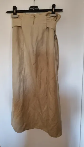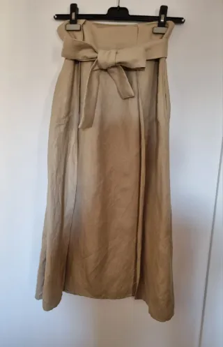 Falda larga de lino en color camel de diseño elegante y cinturón anudado a la cintura. Bolsillos laterales. En muy buen estado.