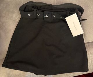 Falda negra con cinturón a juego, ideal para cualquier ocasión. - Cinturón con hebilla cuadrada. - Detalle de ojales en el cinturón. - Tejido elástico para mayor comodidad.