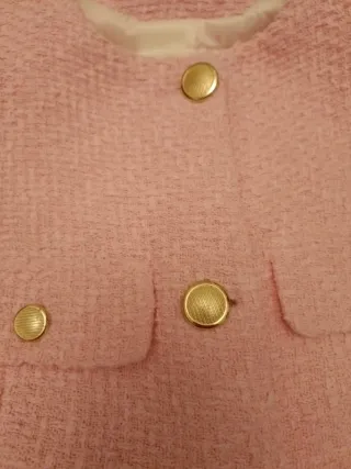 Elegante chaleco de tweed en tono rosa, con detalles dorados y cinturón a juego. - Diseño sin mangas. - Cierre de botones. - Bolsillos frontales con solapa. - Incluye cinturón fino dorado con hebilla.