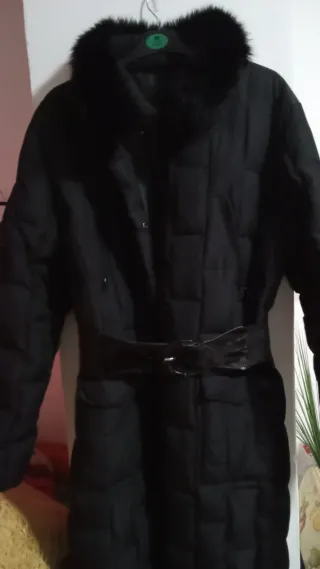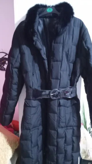 Abrigo de plumón largo con cinturón.Talla 46, xxxl, tiene una sola postura, relleno de plumas es por eso que es muy calentito, color negro, comprado en Milan, el cinturón se lo he puesto yo, se puede probar sin compromiso en persona, también envíos. - Cinturón negro con hebilla. - Cierre de cremallera y botones.