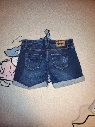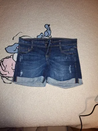 Shorts vaqueros de corte moderno con un ligero efecto desgastado. El bajo está doblado. - Diseño con rotos. - Cintura con trabillas para cinturón. - Cierre de cremallera y botón.