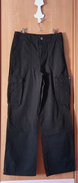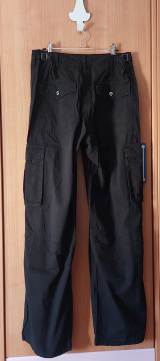 Pantalón cargo de Bershka en color negro. Es un modelo ajustable. - Bolsillos cargo laterales. - Cierre con botones y cremallera. - Trabillas para cinturón. -Cintura ajustable. -No es tela de vaquero.