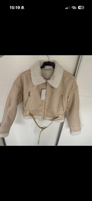 Chaqueta estilo aviador con forro de borreguito. - Cuello de borreguito. - Cinturón ajustable en la cintura. - Bolsillos con cremallera.