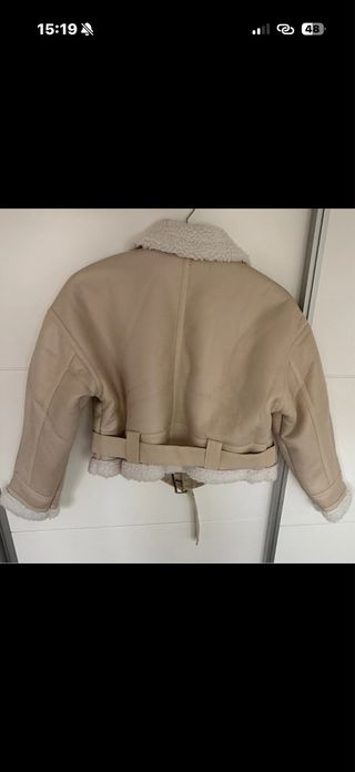 Chaqueta de estilo militar en color beige. - Cierre de cremallera. - Bolsillos frontales con botones. - Detalle de cinturón en la cintura. - Puños ajustables. Una pequeña mancha adelante lado derecho . quizás salga , por esto el precio 😊