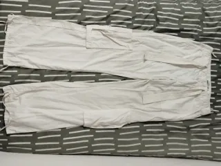 Pantalones de estilo cargo en color blanco.marca MNG talla s Cuentan con cinturón y cordones ajustables en los bajos.esta un poco arrugado pero si lo planchas está como nuevo. - Bolsillos cargo en los laterales. - Cinturón de tela a juego. - Cordones ajustables en los tobillos.