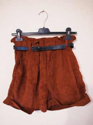 Pantalón corto de pana en color granate, con un diseño de cintura alta y cinturón a juego. Como nuevo. - Tejido de pana acanalada. - Cintura elástica con cinturón de hebilla. - Bajo con vuelta.
