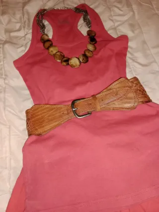 Conjunto de mujer que incluye un collar y un cinturón. - Collar con cuentas de madera y detalles metálicos. - Cinturón ancho de cuero con diseño trenzado.